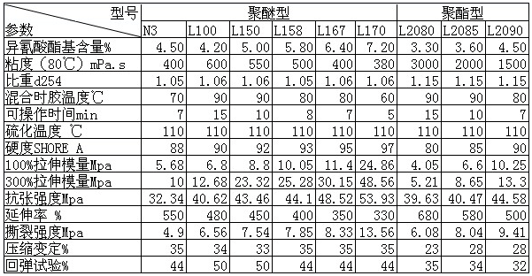 說明: 1.建議模具溫度控制為100℃左右;后硫化溫度為90-110℃左右。 2.L100、L150膠,用于陶瓷模具時,具有特強的抗粘粉性能。 3.酯型PU膠在常溫下粘度較大,使用前最好先烘烤。 4.用于陶瓷模具時,建議靜壓模使用優良耐油的聚酯型PU膠,普通模使用優良耐水的聚醚型PU膠。 5.在實際提供的PU膠時,NCO可能在有±0.1%的變化范圍,固化劑需做相應的調整,其性能不受影響。 6.如需特殊用途PU膠,請來電咨詢。
